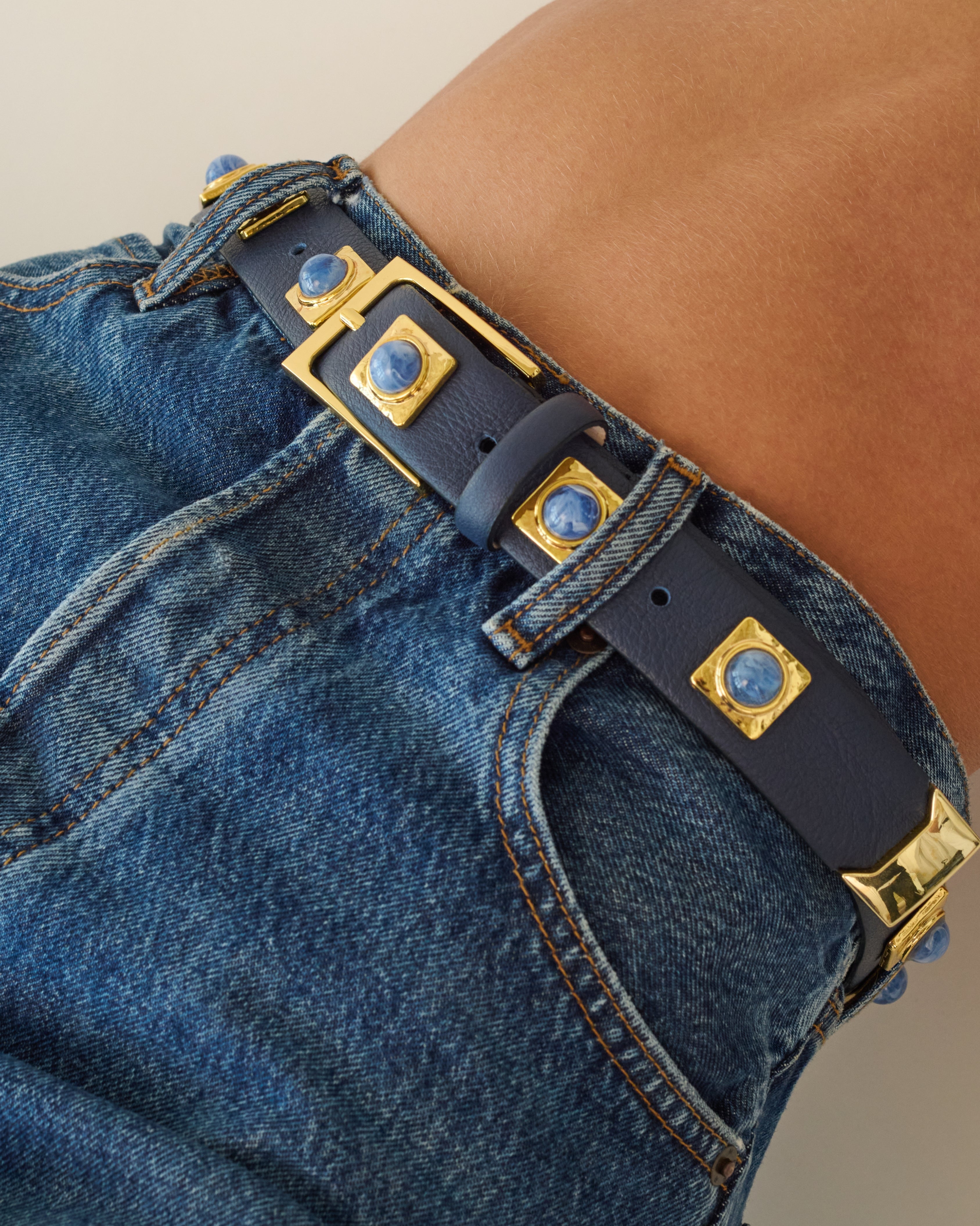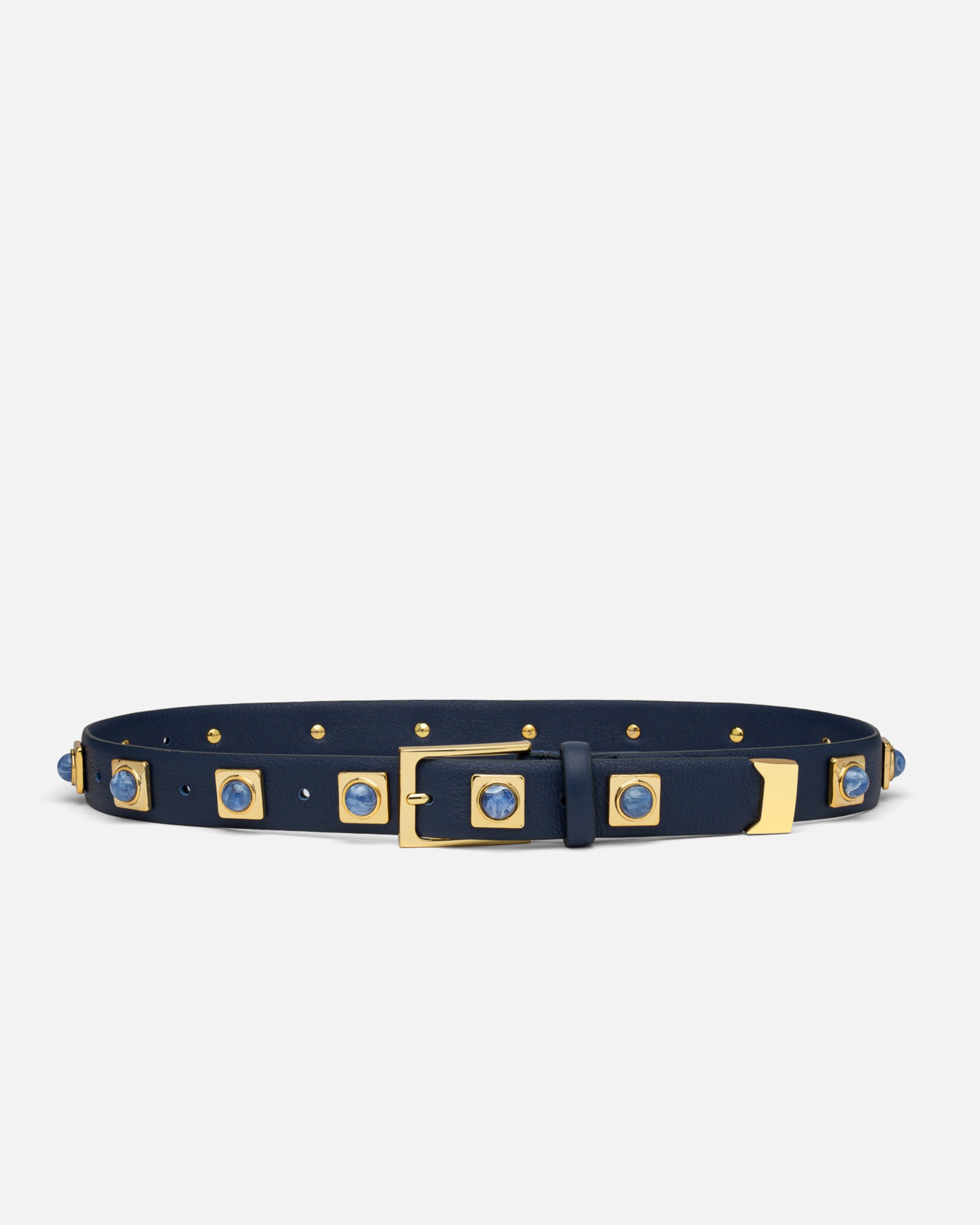 Soft Italian leather, made memorable by jewelry-like hardware—navy studs and a structured rectangular shape buckle in 24k gold tone.