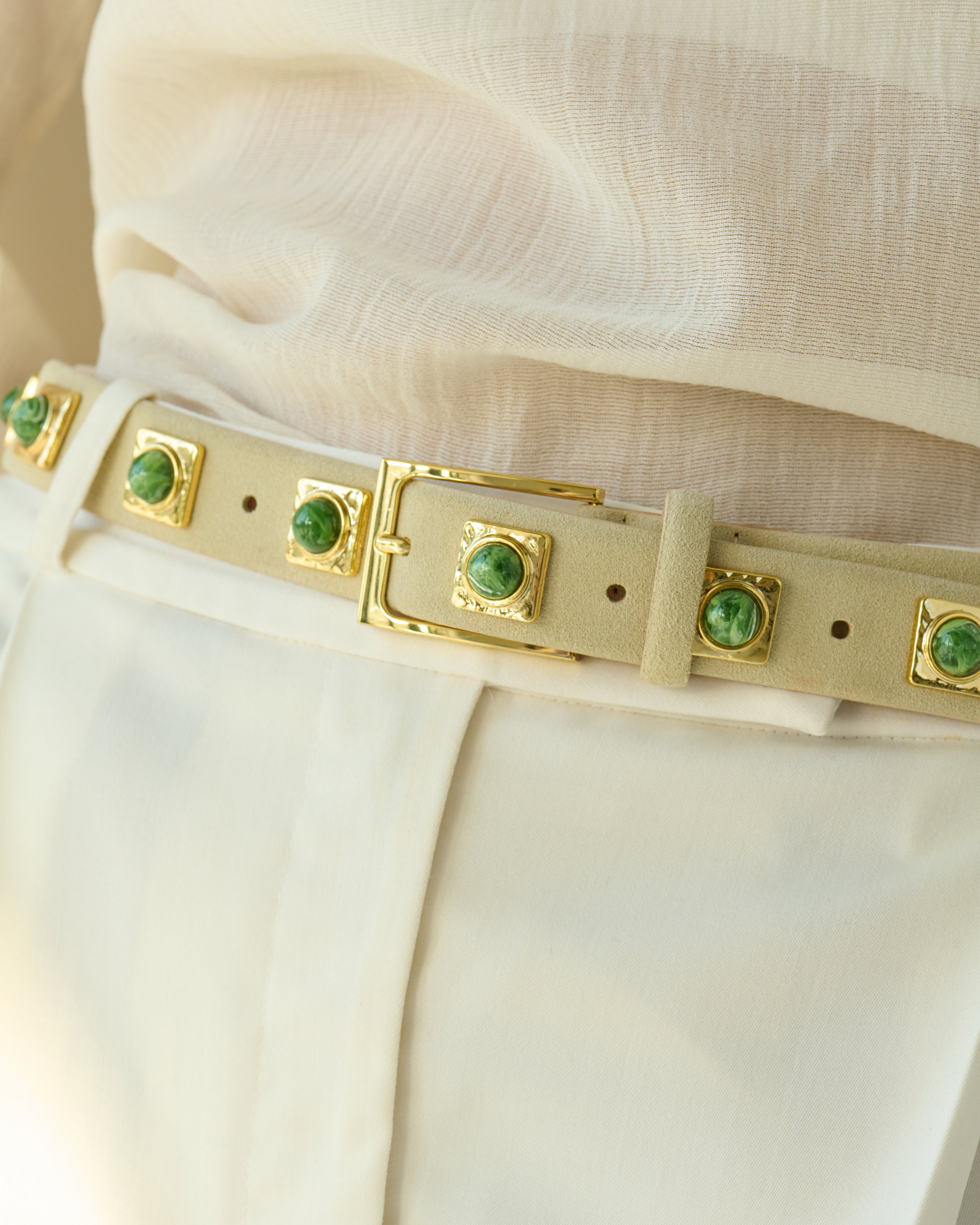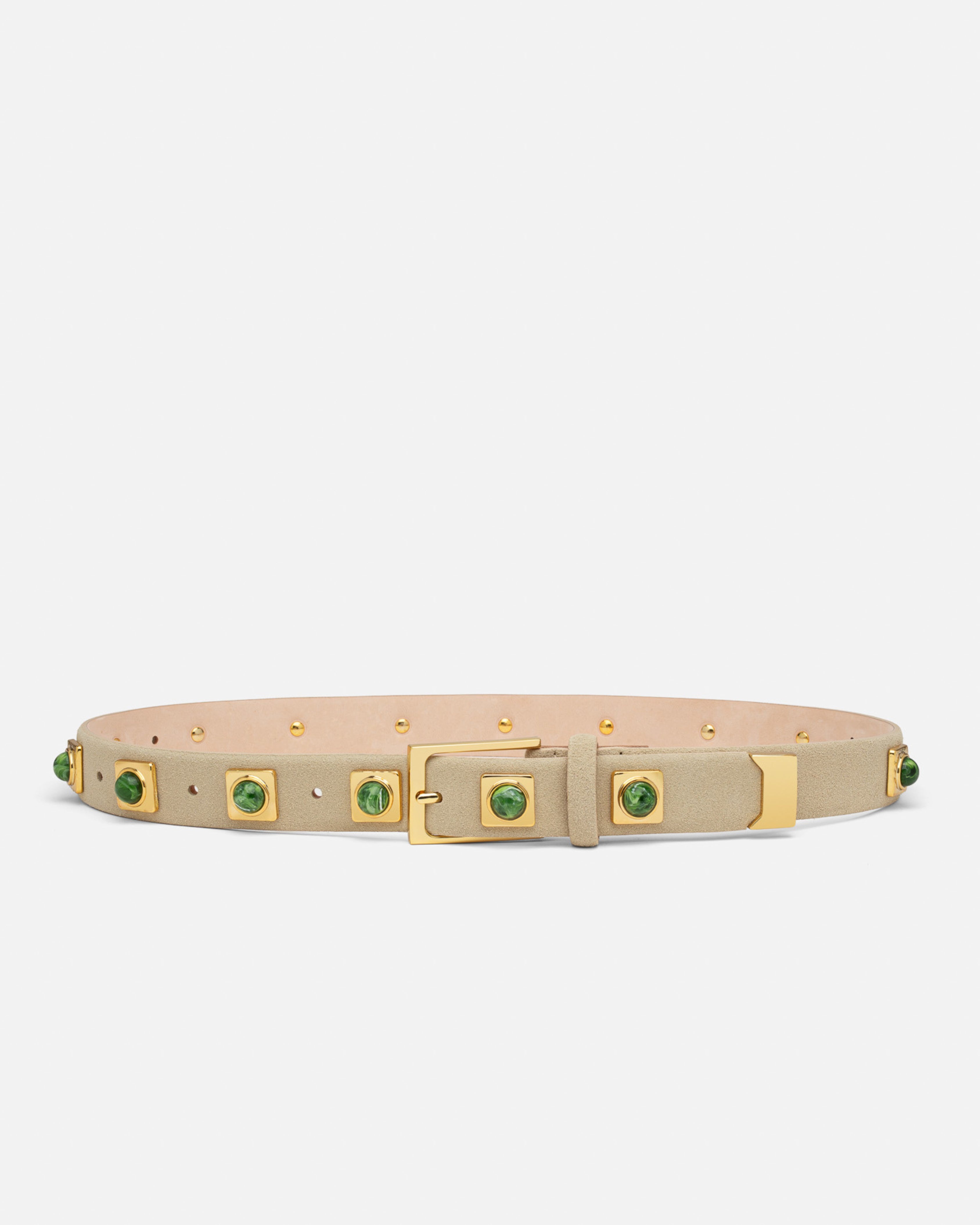 Soft Italian leather, made memorable by jewelry-like hardware—green studs and a structured rectangular shape buckle in 24k gold tone.