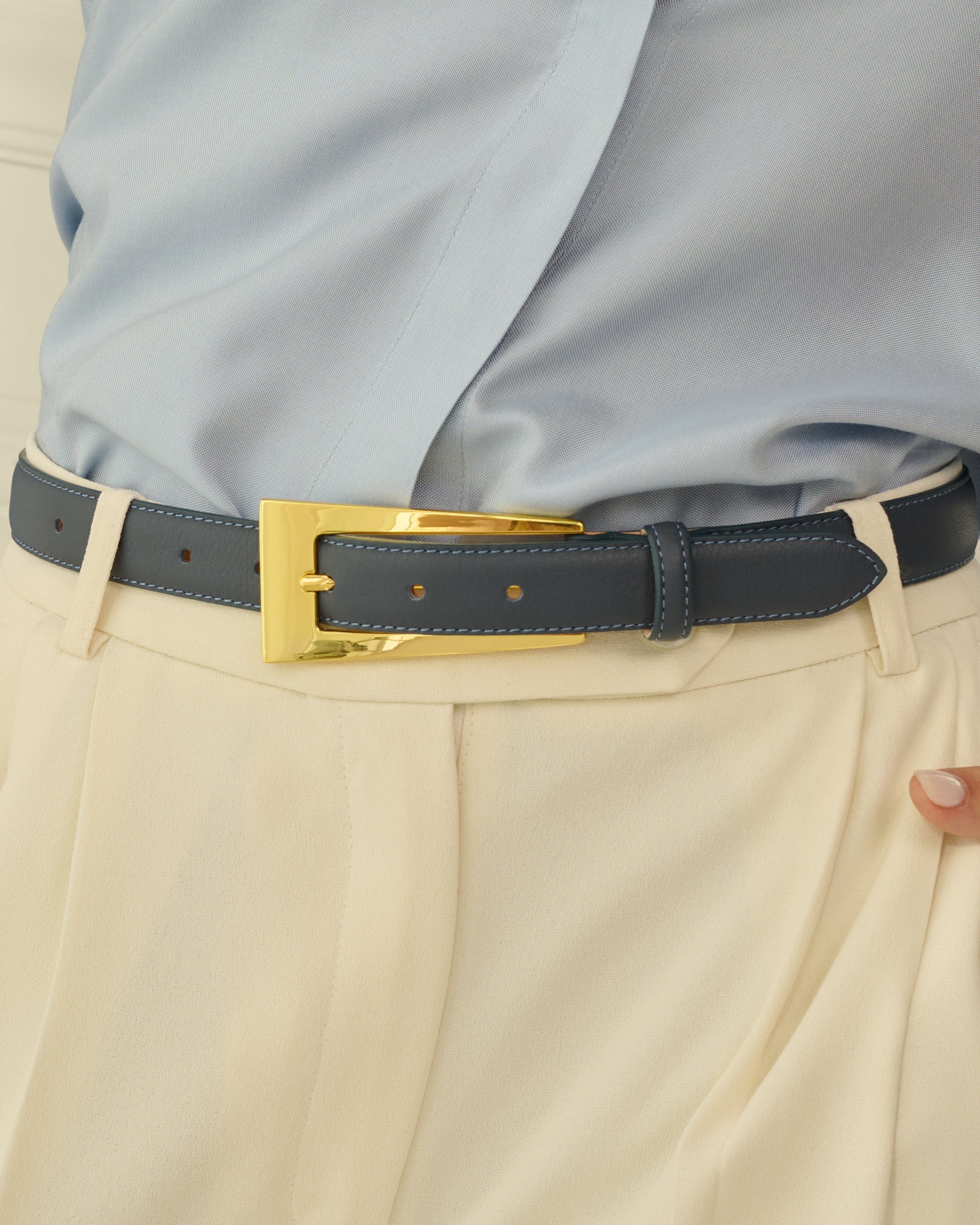 Italian leather belt with an elongated trapezoidal buckle. Lined with buttery soft nubuck. Buckle hardware in 24k gold tone.