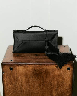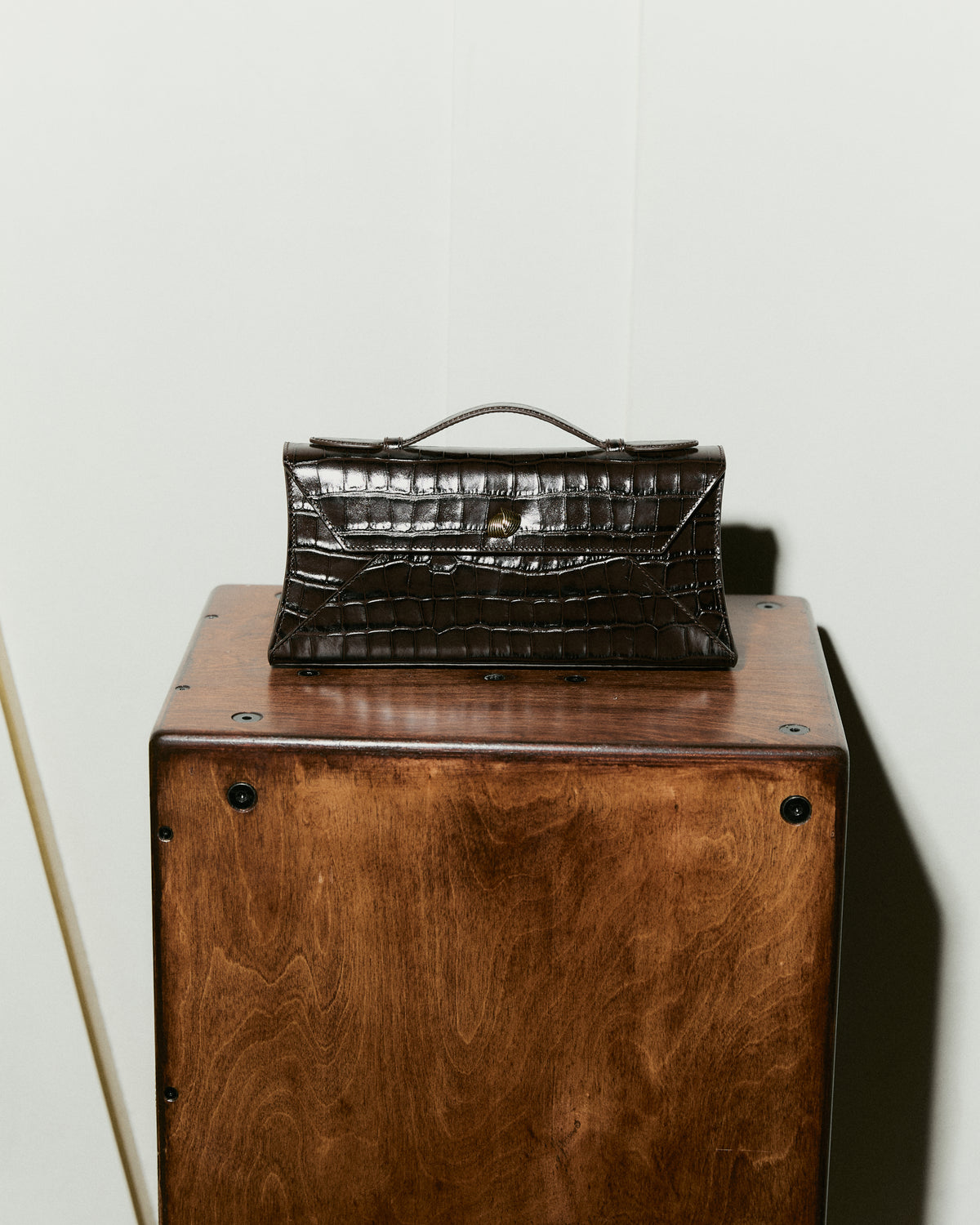 The Cassandra Clutch began as a sketch inspired by a vintage evening bag spotted in Florence – an elongated silhouette that rested beautifully against the body and sat just as well on a dinner table. Cassandra reinterpreted the idea through a modern lens: softened curvature to mirror the natural lines of the body, a top handle that collapses to transform into a sleek clutch, and a closure that disappears into the design.