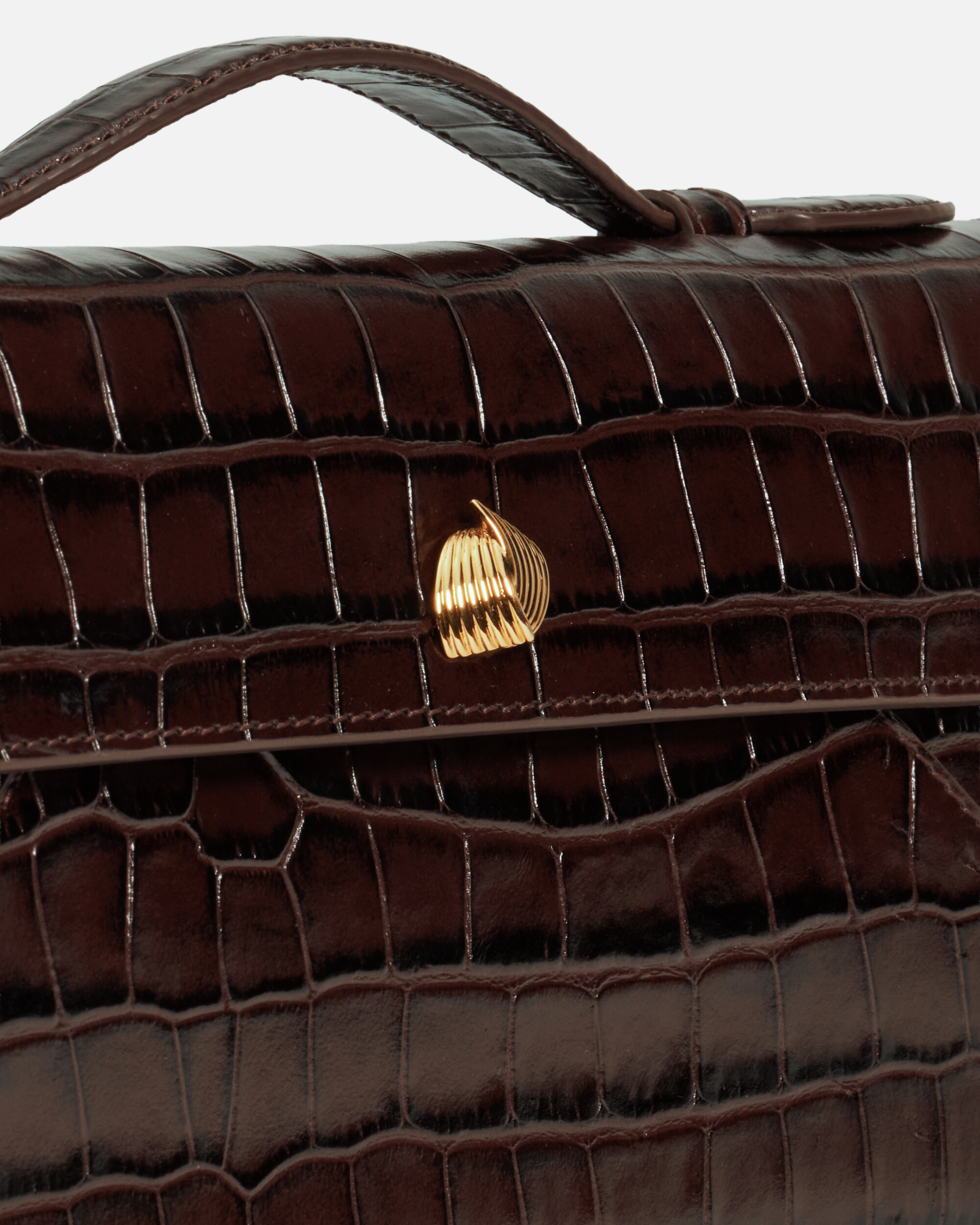 Crafted in deep espresso croc-embossed leather selected for its structure and subtle sheen. The material gives the silhouette a grounded, refined feel. Finished with custom-molded Italian hardware—an Aureum signature—inspired by the clean lines of the Vienna Earrings.