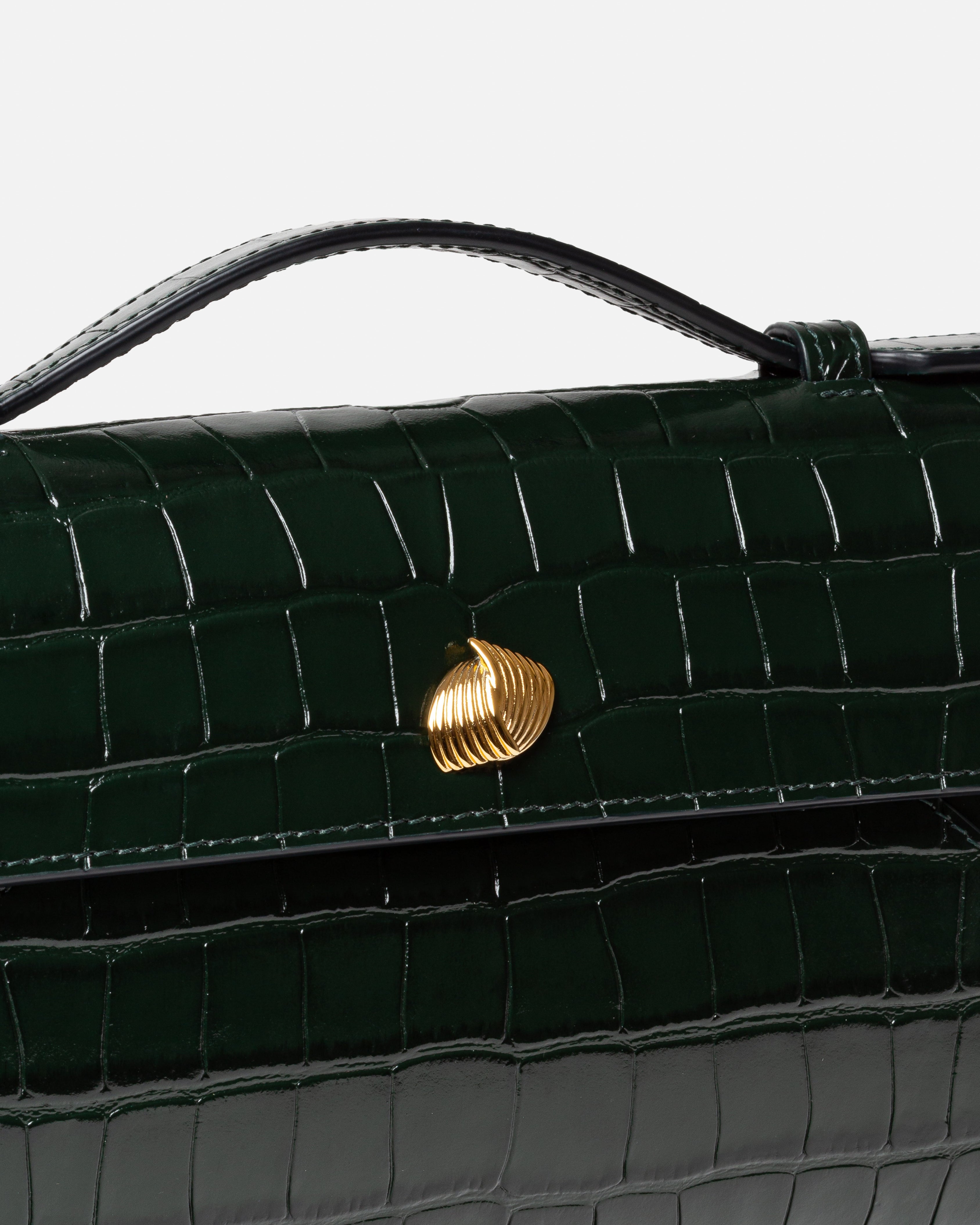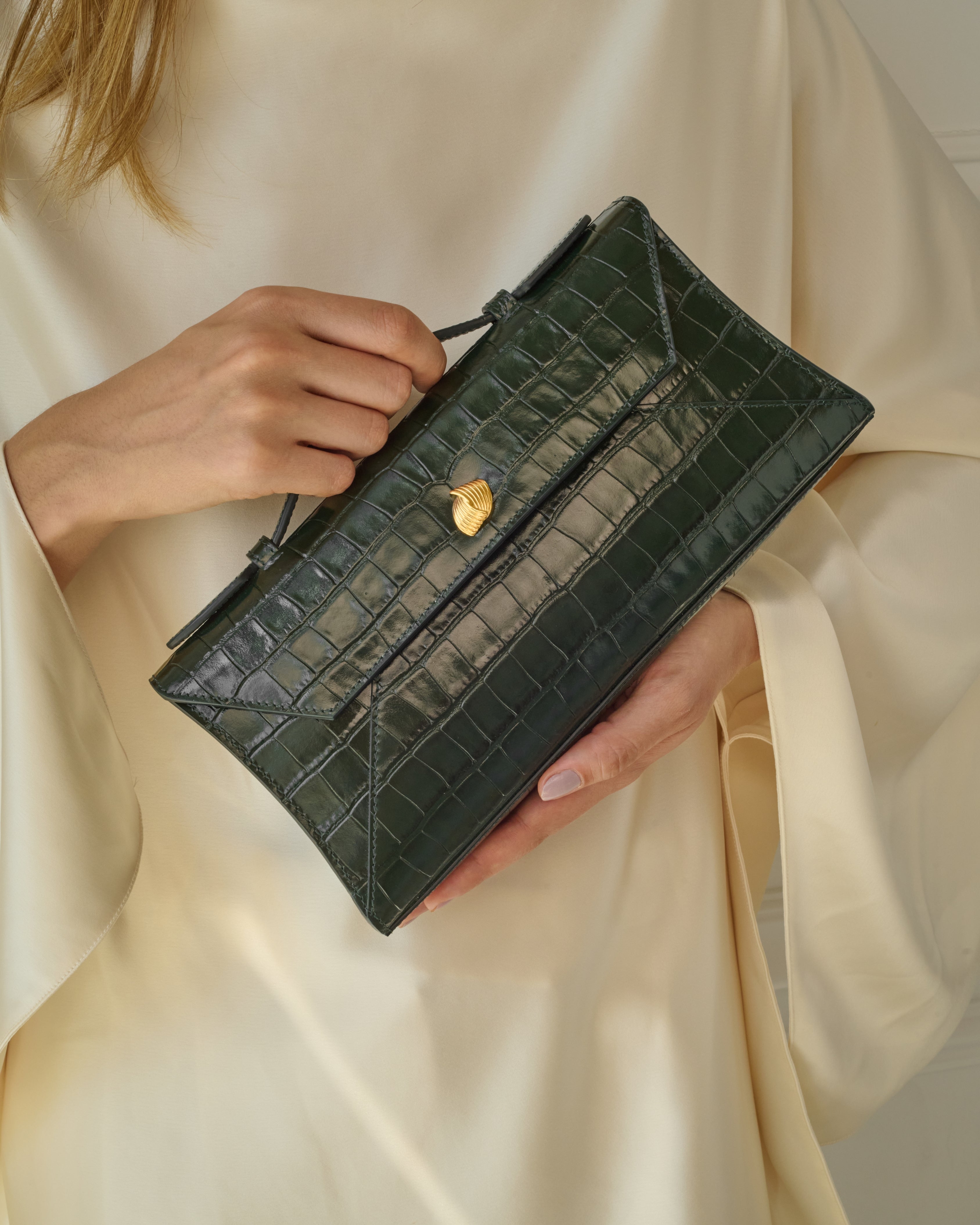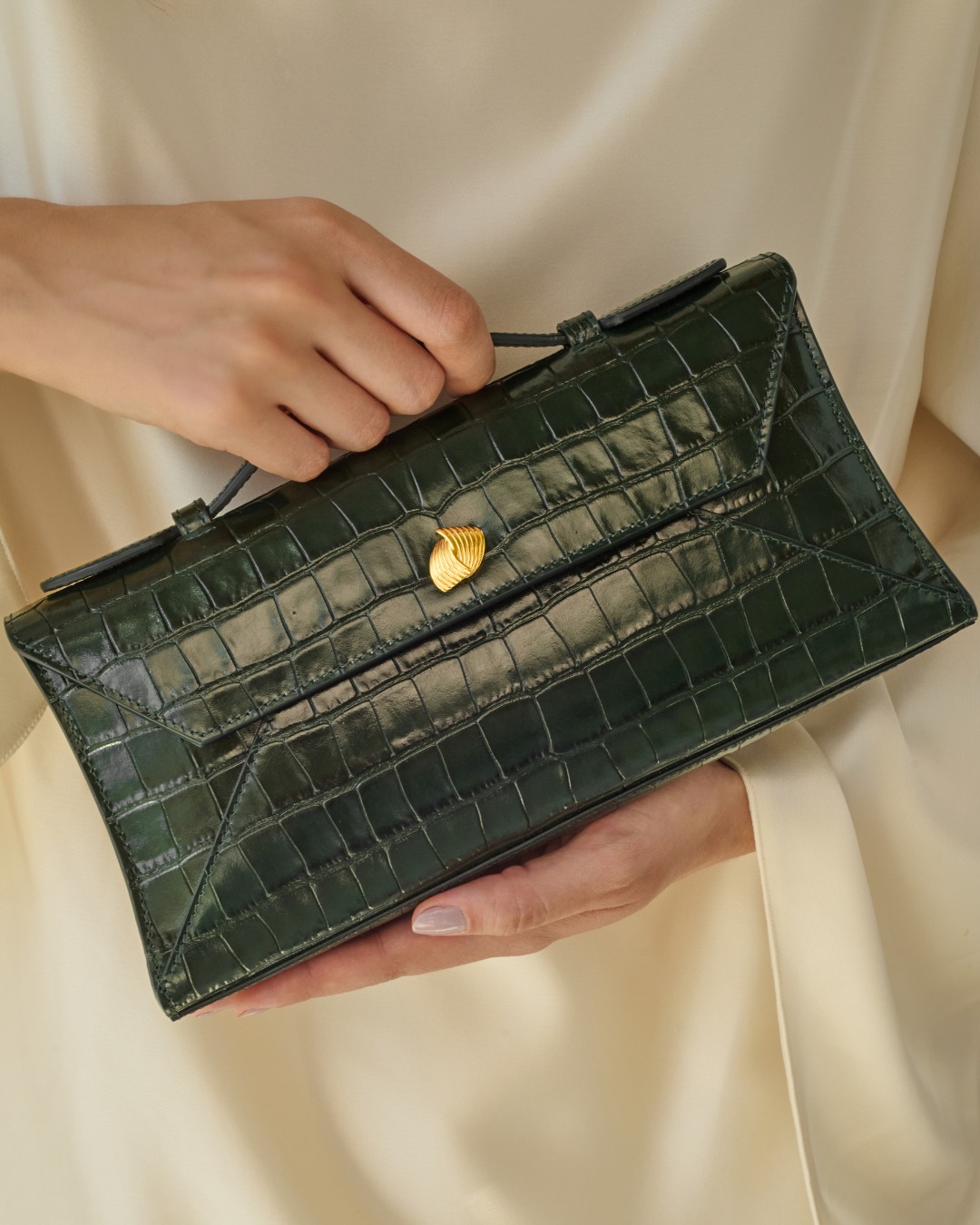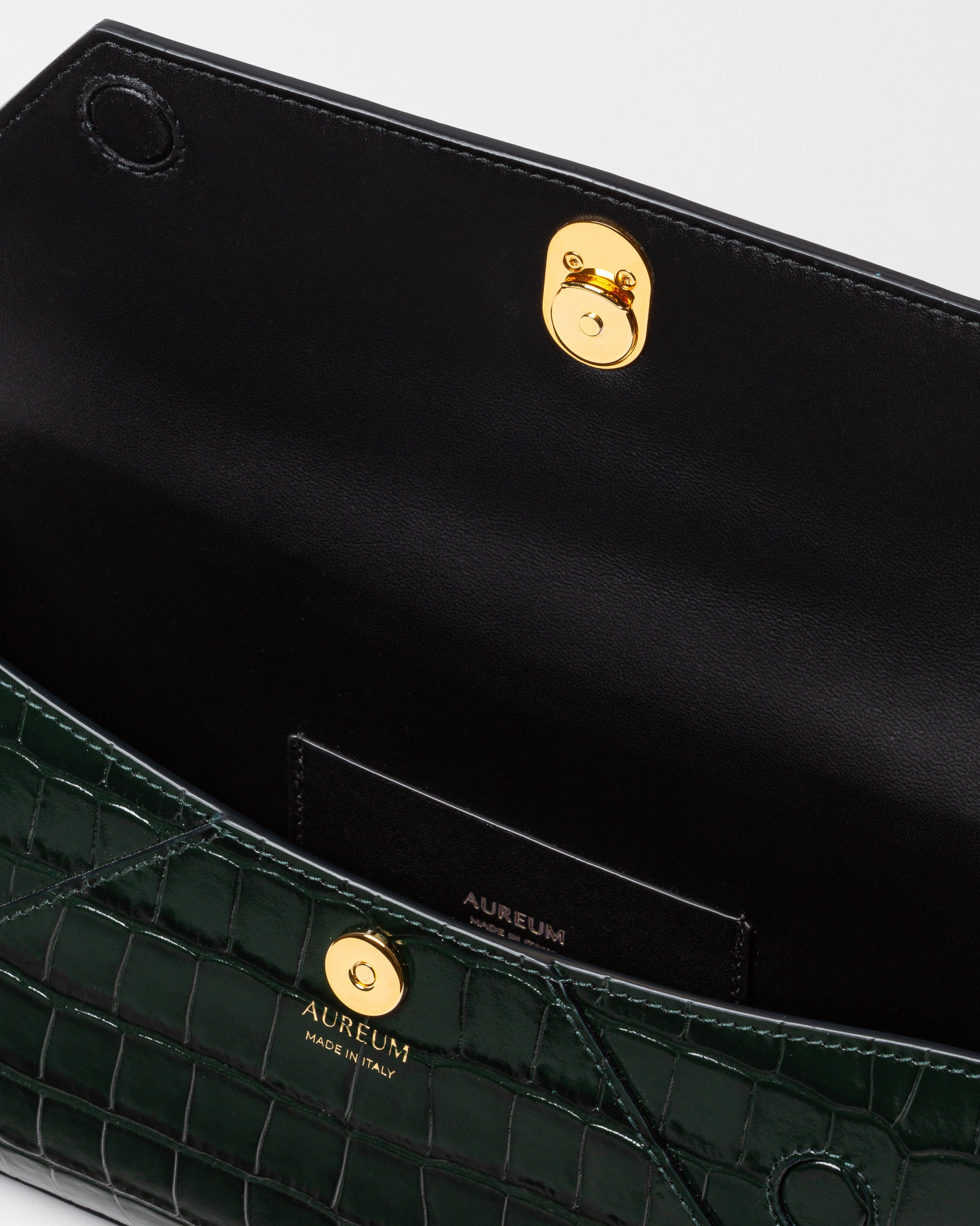 Crafted in emerald croc-embossed leather selected for its structure and subtle sheen. The material gives the silhouette a grounded, refined feel. Finished with custom-molded Italian hardware—an Aureum signature—inspired by the clean lines of the Vienna Earrings.