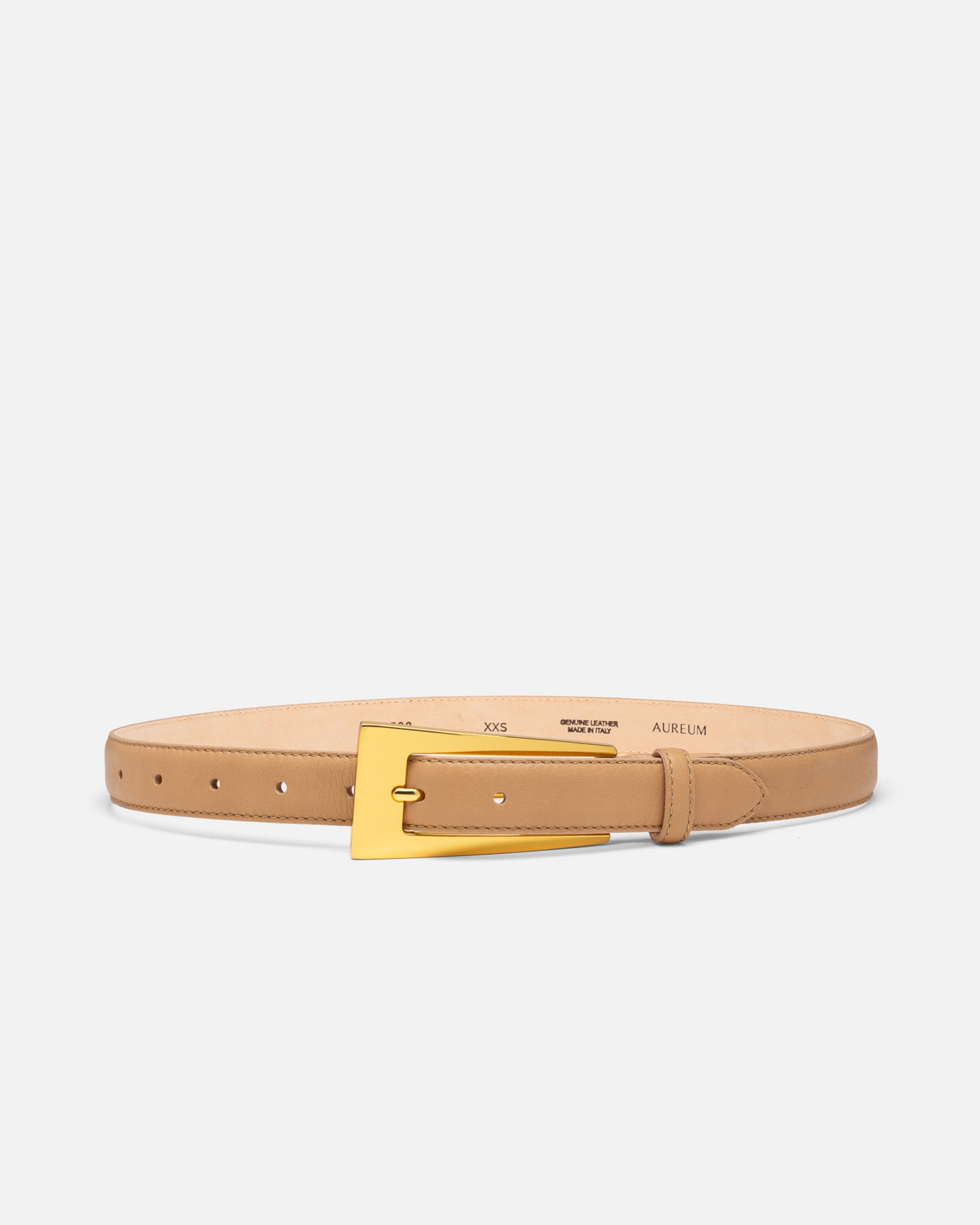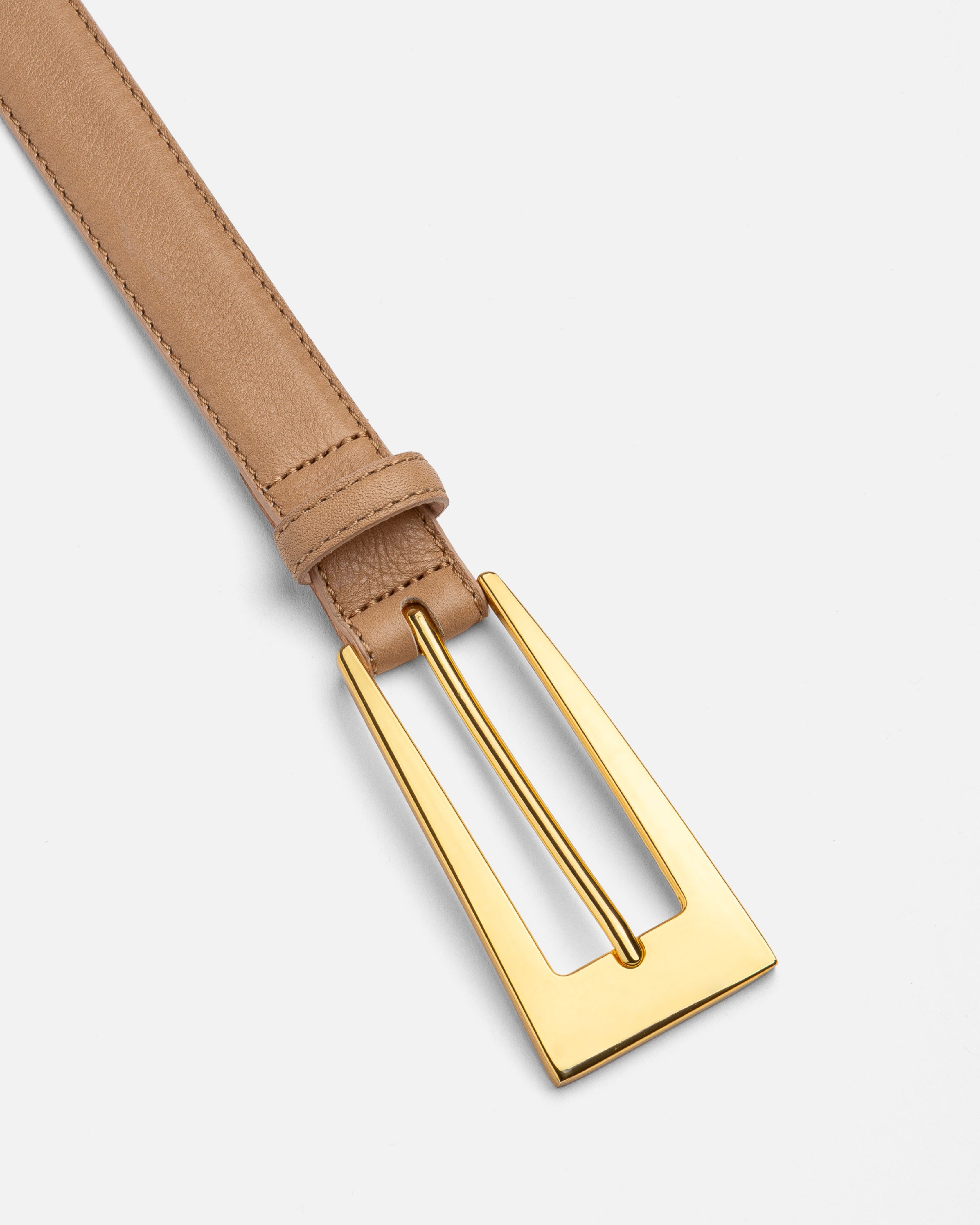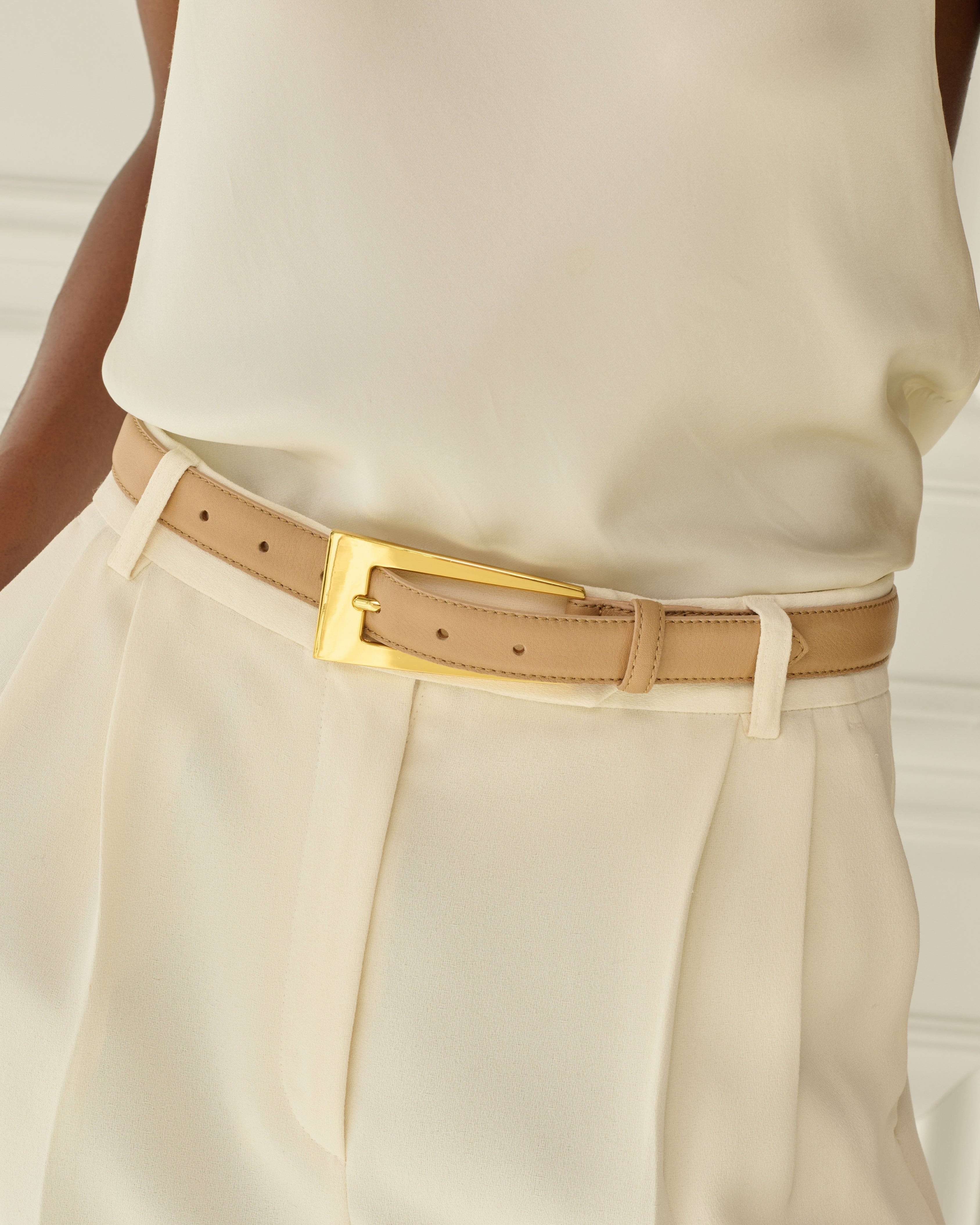 Italian leather belt with an elongated trapezoidal buckle. Lined with buttery soft nubuck. Buckle hardware in 24k gold tone. Limited edition.