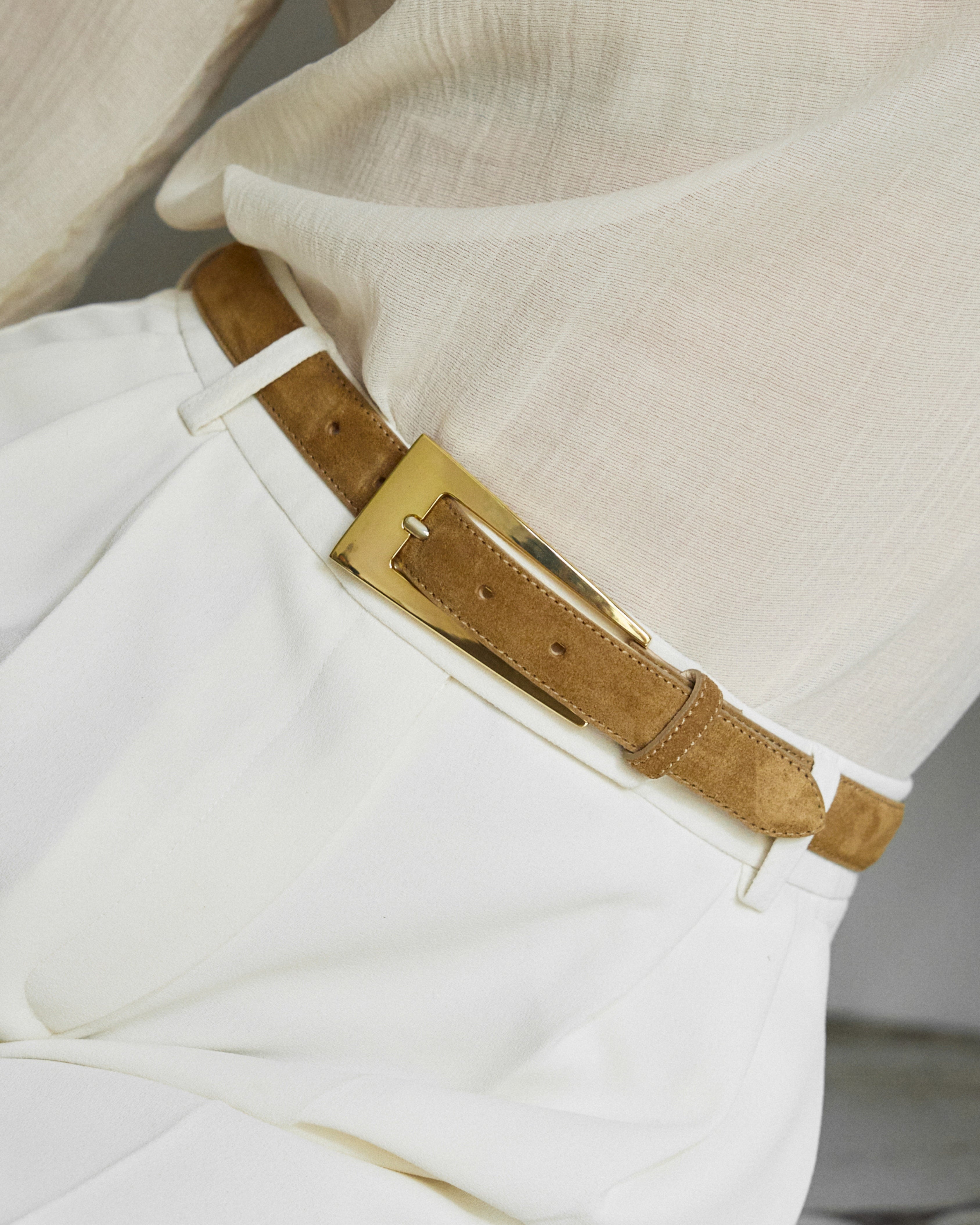 Italian suede leather belt with an elongated trapezoidal buckle. Lined with buttery soft nubuck. Buckle hardware in gold tone.