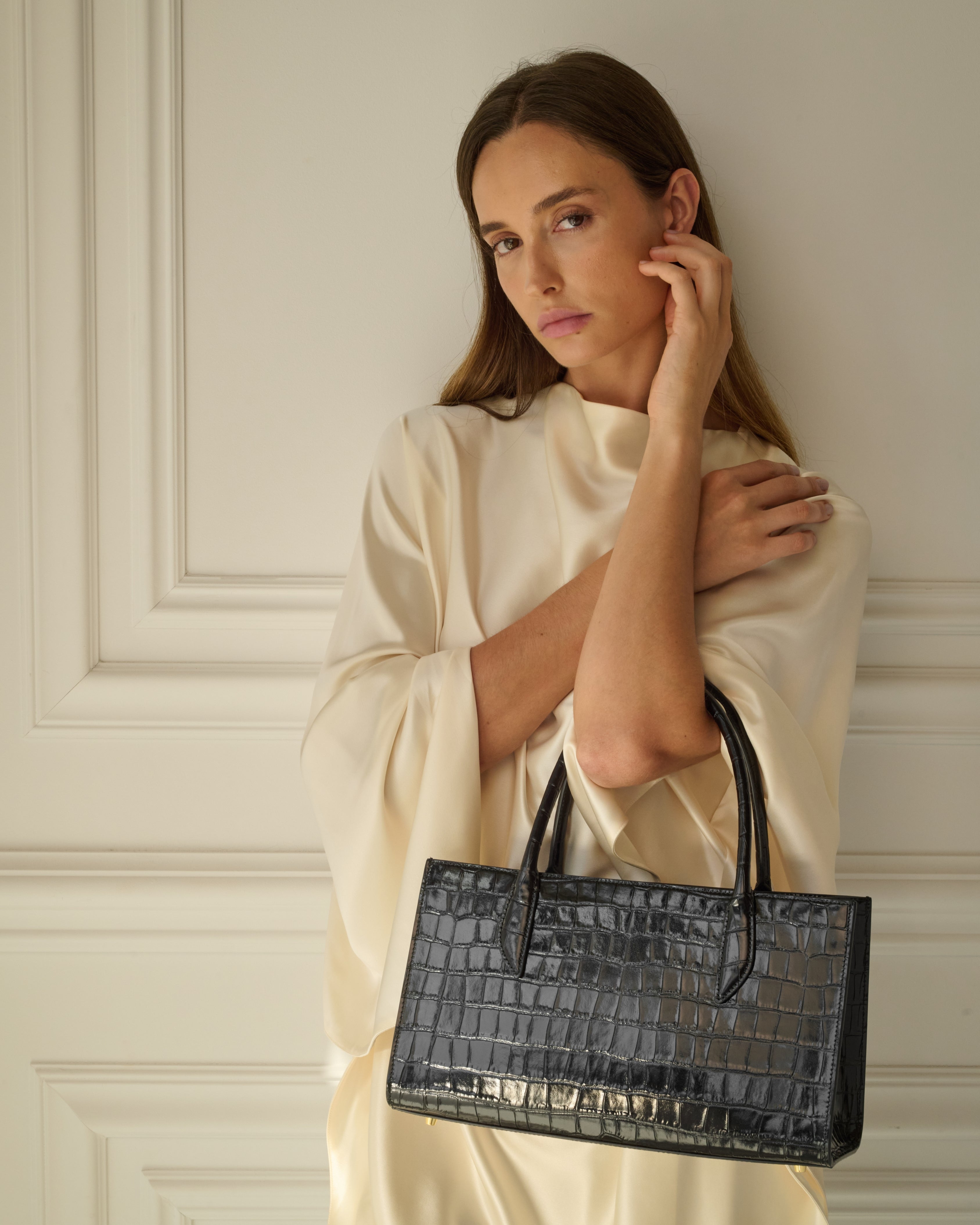 An east–west silhouette in 100% full-grain Italian leather, handcrafted in Florence by a family-owned atelier in small batches. Every stage from materials to craftsmanship to final assembly is completed by artisans using time-honored techniques. Designed with a spacious open interior, zippered compartment, and protective base, it balances structure with everyday ease. Subtle Aureum codes, like handle stitching inspired by the Irina earrings, make it a true expression of understated luxury.